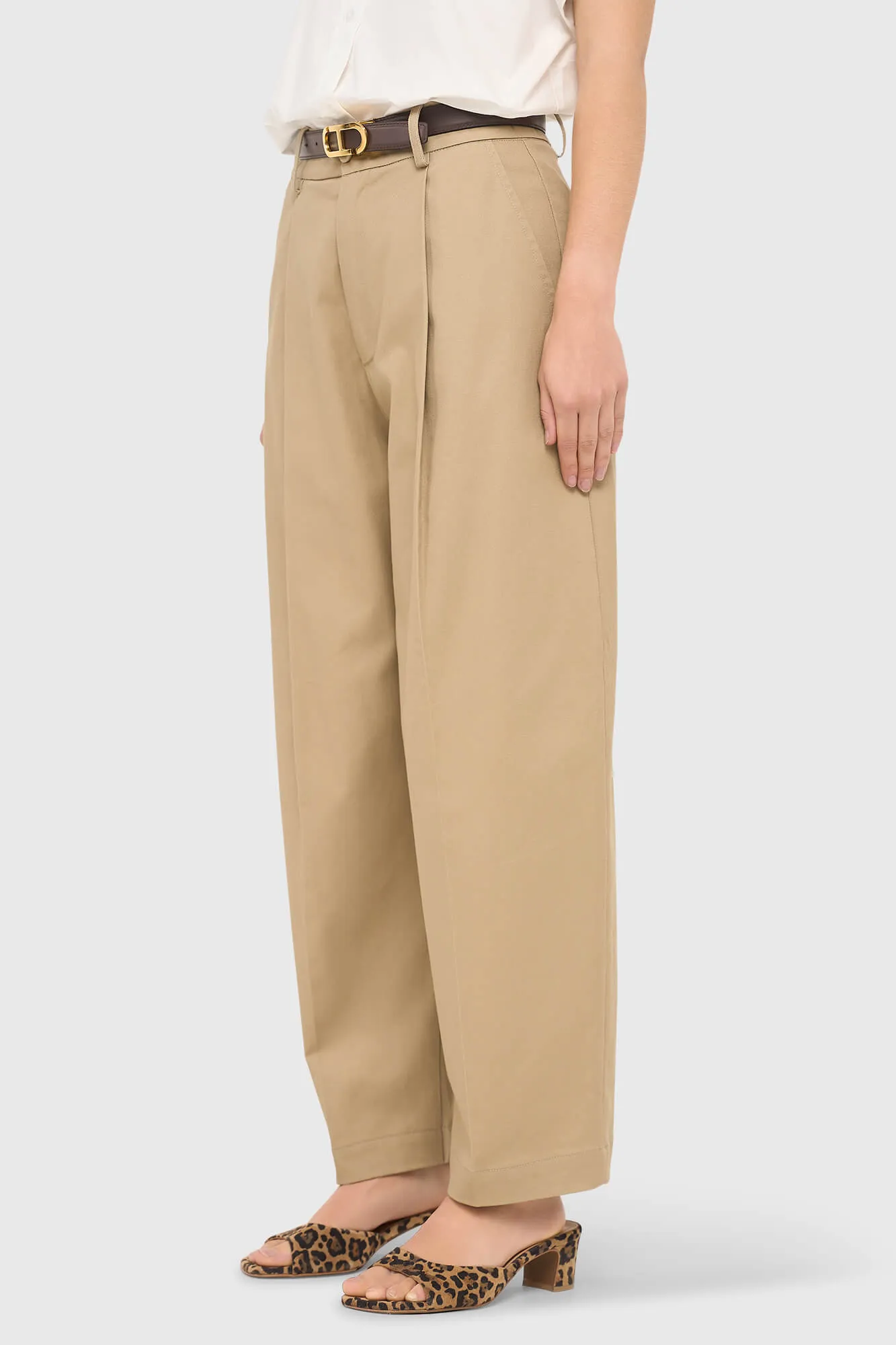 De beige katoenen paperbag broek steekzakken barrel BALTI van JANICE is een stijlvolle toevoeging aan je garderobe. Deze dames broek is uitgevoerd in een zachte beige tint en gemaakt van 97% katoen en 3% elastine, wat zorgt voor een comfortabele kwaliteit met subtiele bewegingsvrijheid. De highrise taille geeft de broek een elegante uitstraling, terwijl de barrel-fit broekspijpen een moderne en ontspannen look creëren. De pijpen kunnen aan de onderkant omgeslagen worden voor een extra nonchalant effect, waardoor het item eenvoudig aan te passen is aan verschillende outfits. De twee steekzakken maken het ontwerp compleet en voegen zowel functionaliteit als comfort toe.