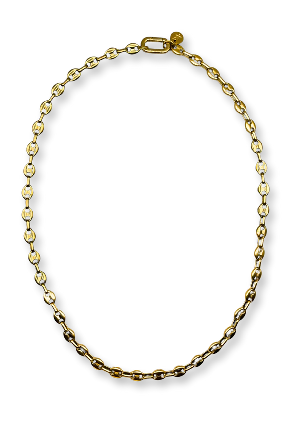Sleek and minimal, this delicate bean-link necklace adds subtle texture and shine. A refined piece that’s perfect for everyday wear or elegant layering.