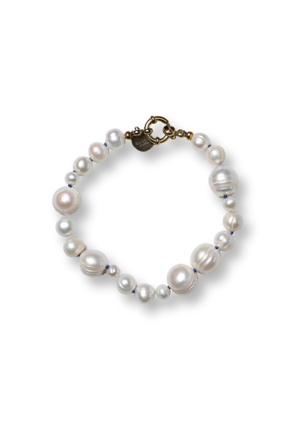 This bold bracelet is made with organically shaped baroque sweetwater pearls, combining soft shimmer with character-rich form. A unique piece that adds a natural twist to any look, finished with a 14K gold-plated clasp for contrast.