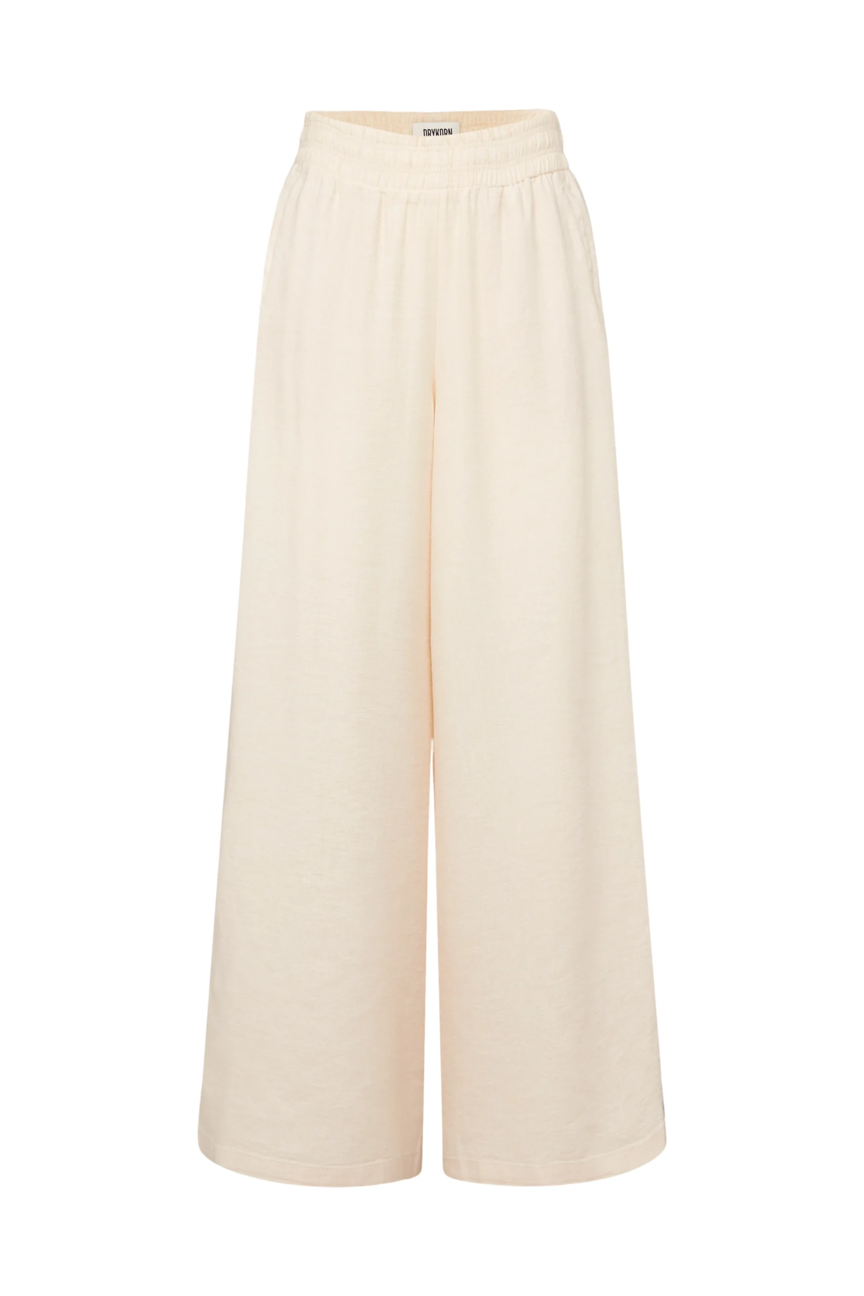 CEILING is een wijde broek met elastische tailleband. De nonchalante pasvorm wordt laag op de heupen gedragen. De zomerse linnen-viscose-mix biedt door zijn eigenschappen een licht en aangenaam draagcomfort.