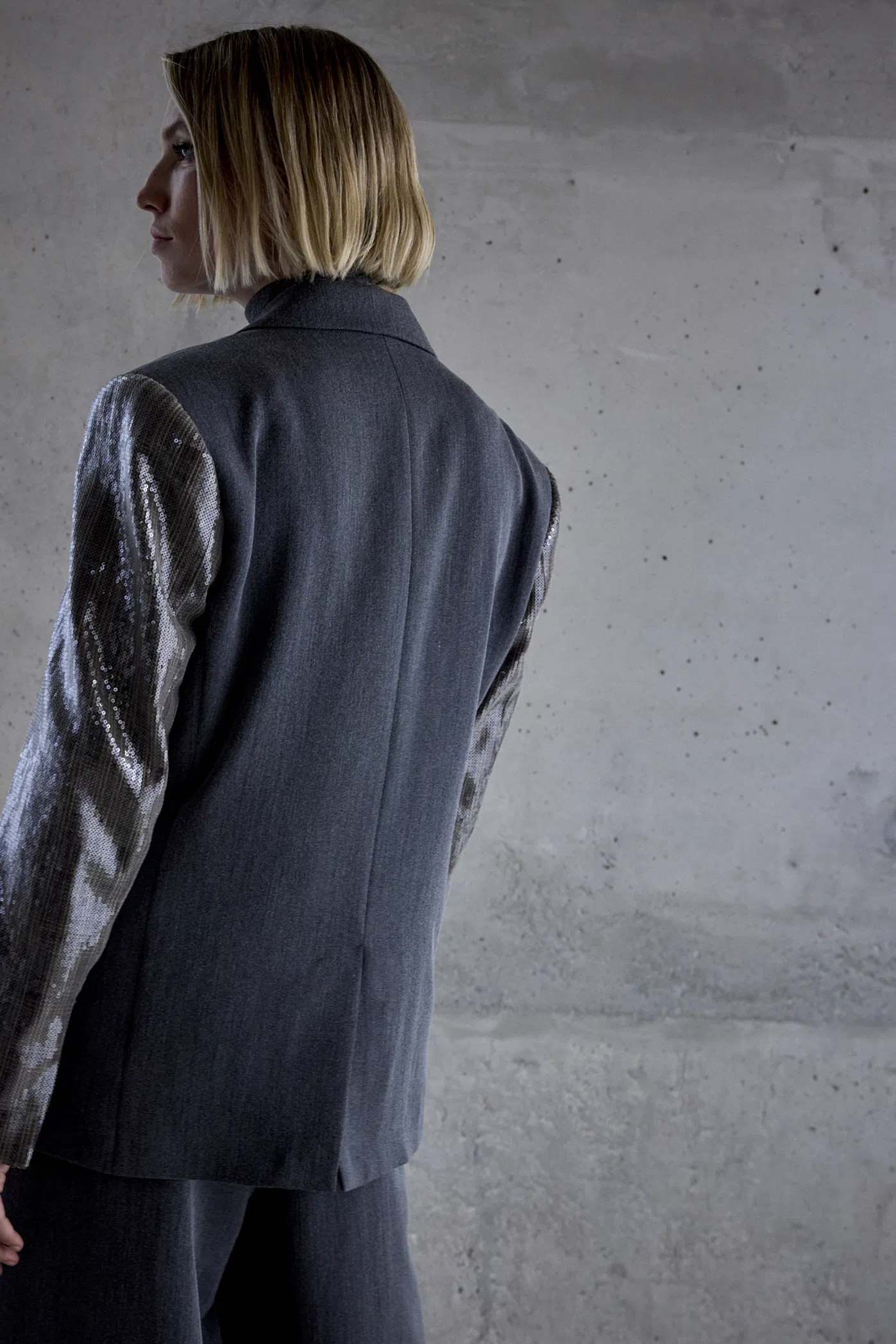 Een boyfriend blazer met pailletten op de mouwen, wat deze blazer een bijzondere uitstraling geeft.