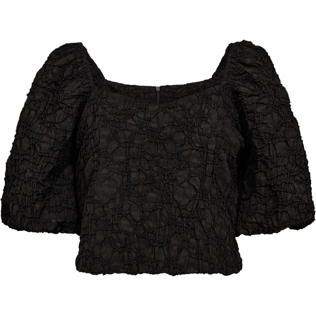 Gesmokte korte top met pof mouw en ritsje op de rug.