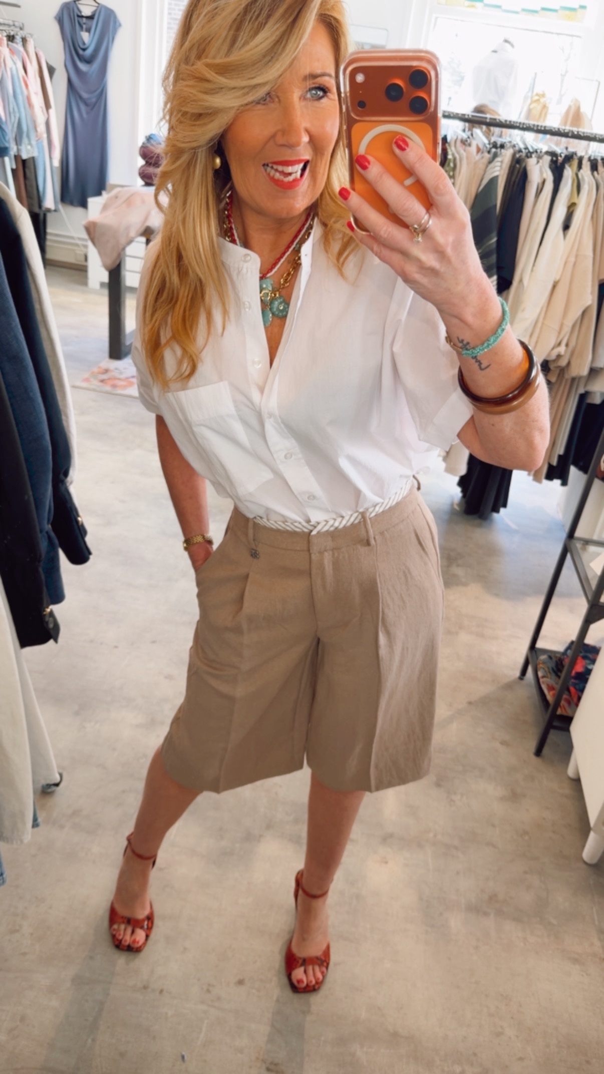 De Emra bermuda in Sand Beige is gemaakt van een aerowashed viscoseblend met een linnenlook structuur. De wide-leg bermuda is afgewerkt met een pinstripe detail aan de tailleband voor een verfijnde touch. Draag comfortabel met een mooie top of maak je look compleet met de bijpassende Dayva blazer voor een stijlvolle co-ord set.