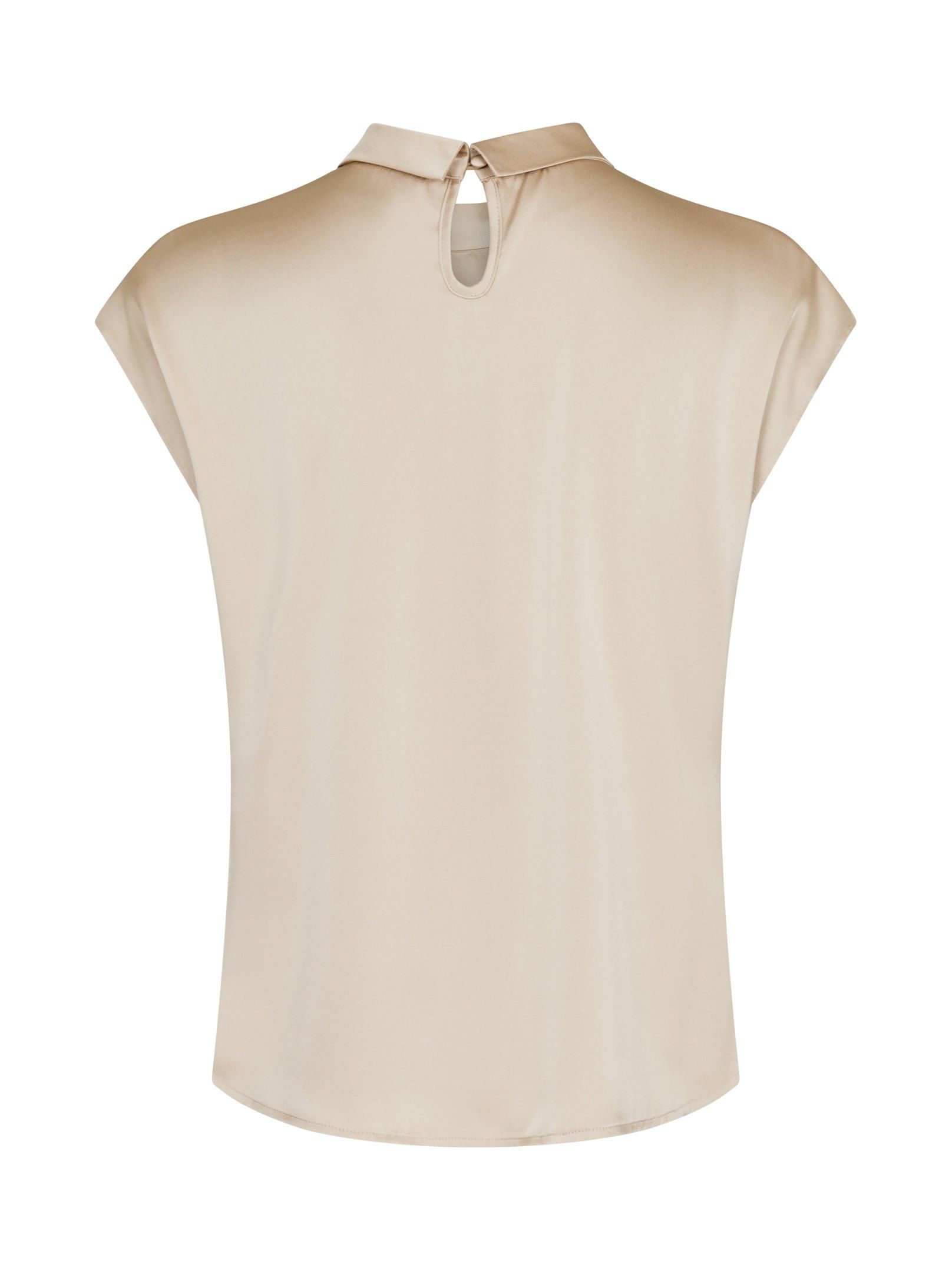 Drapy vrouwelijke blouse met kapmouwen in een zachte satijn. De blouse heeft een mooie knoopdetail in de hals. De blouse heeft een losse pasvorm, maar blijft toch vrouwelijk, en kan zowel casual als chique gedragen worden voor elke gelegenheid.
