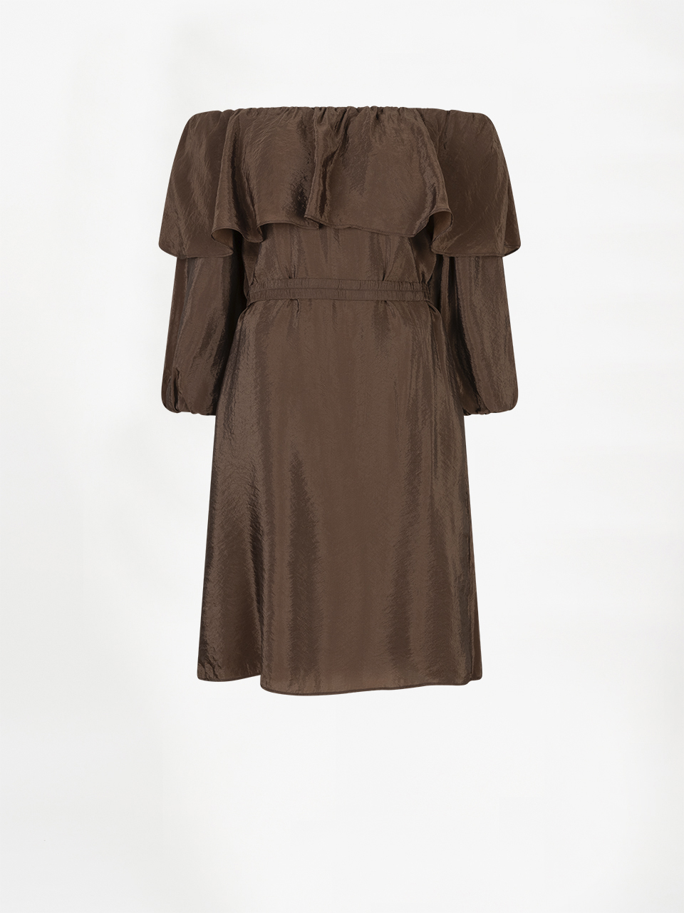 De Kyo jurk in Chocolate Brown brengt een speelse, romantische touch aan je zomerlook. Gemaakt van luchtige viscosemix crêpe met een subtiele glans. De brede volant-halslijn kan off-shoulder gedragen worden voor een vrouwelijke uitstraling, of juist hoger voor een klassieker silhouet. De losse pasvorm en wijde mouwen zorgen voor natuurlijke beweging. Dankzij de voering van viscose voile voelt de jurk zacht en comfortabel aan — ideaal voor zonnige dagen en zomerse momenten.
