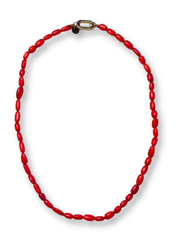 This elegant piece is handcrafted with red coral beads, offering a warm, natural tone and a timeless look. Finished with a 14K gold-plated stainless steel clasp for a refined touch.