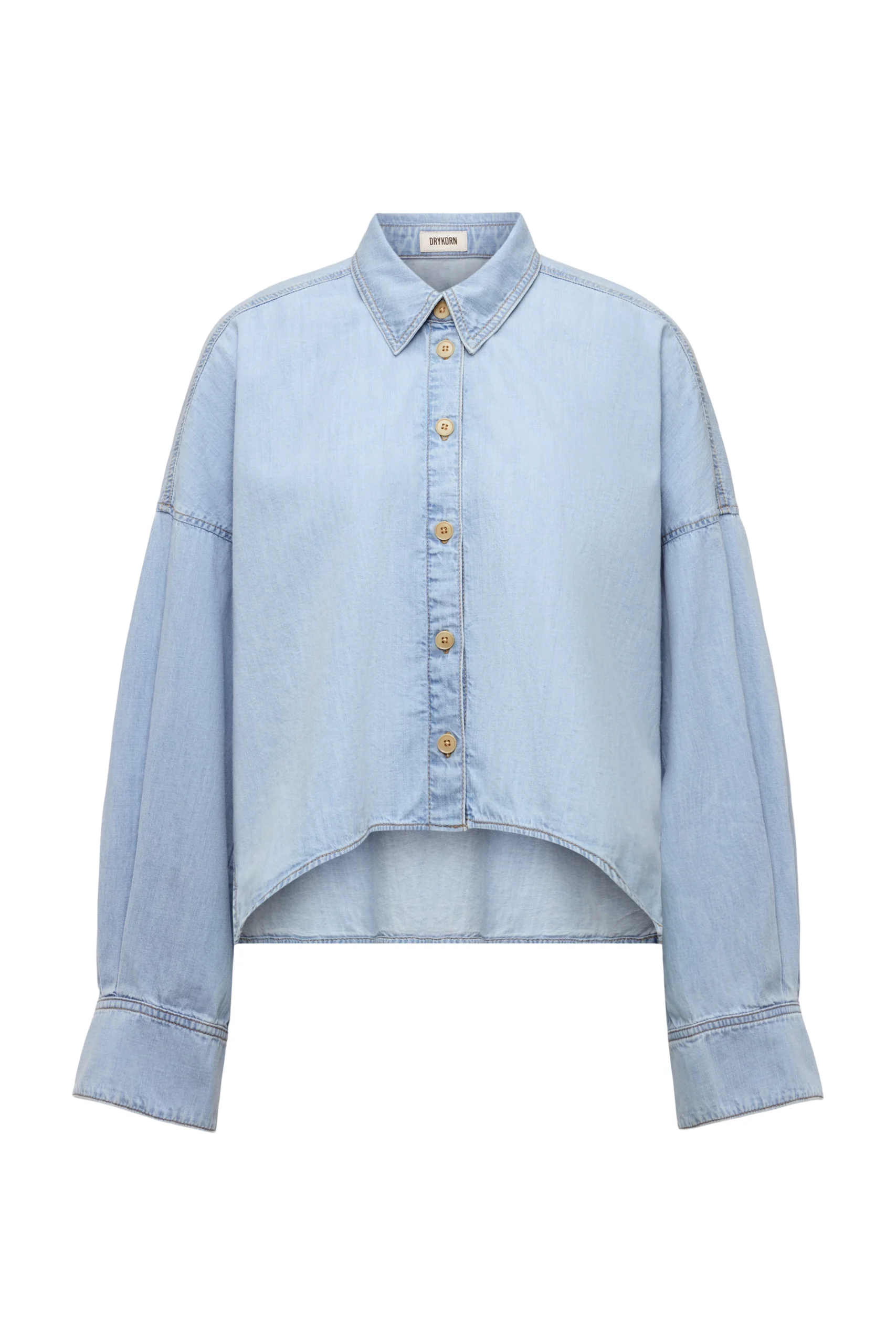 OSHIA is een oversized overhemdblouse met loshangende schouders en extra lange mouwen. De indigo denim heeft een lichte kleur en een licht waseffect, waardoor het een echte alledaagse essential is.