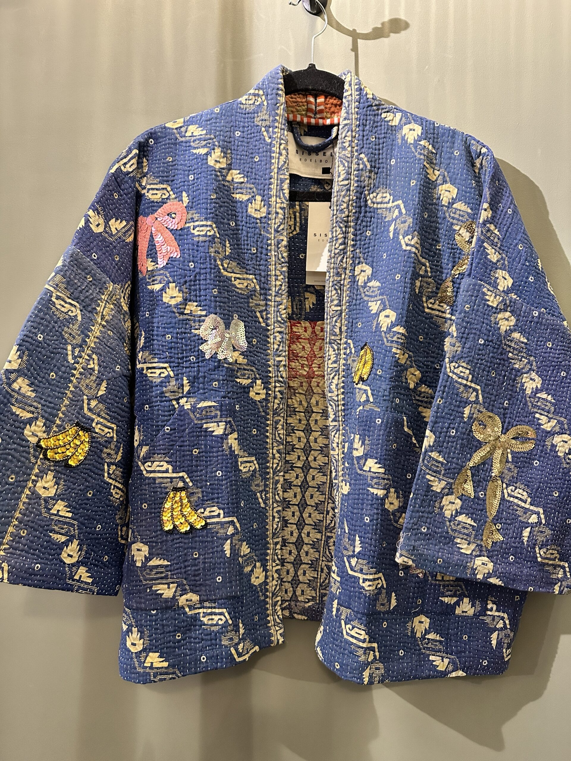 Tyler Sequins Jacket is made from vintage kantha blankets where sequins gently are decorated all over by hand in a beautiful color range. The jacket has a loose fit with 3/4 sleeves and front pockets. All seams inside have been covered with cotton tapes for an upgraded finish.