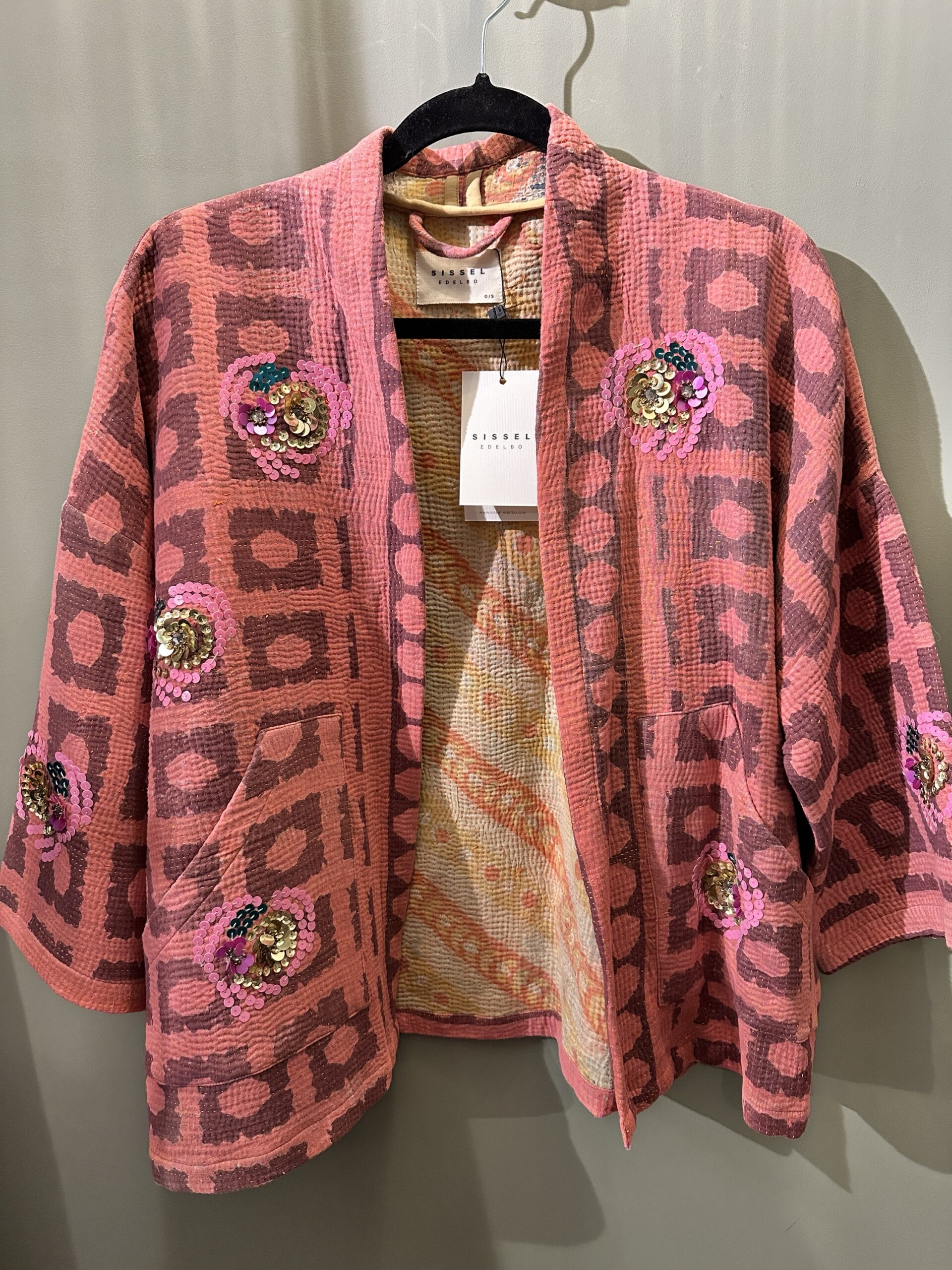 Tyler Jacket is made from vintage Kantha Blankets. This style is reversible and can be worn on both sides. It has a boxy loose body shape with 3/4 sleeves and front pockets. Charming bindings covers the edges for pockets and body seams.