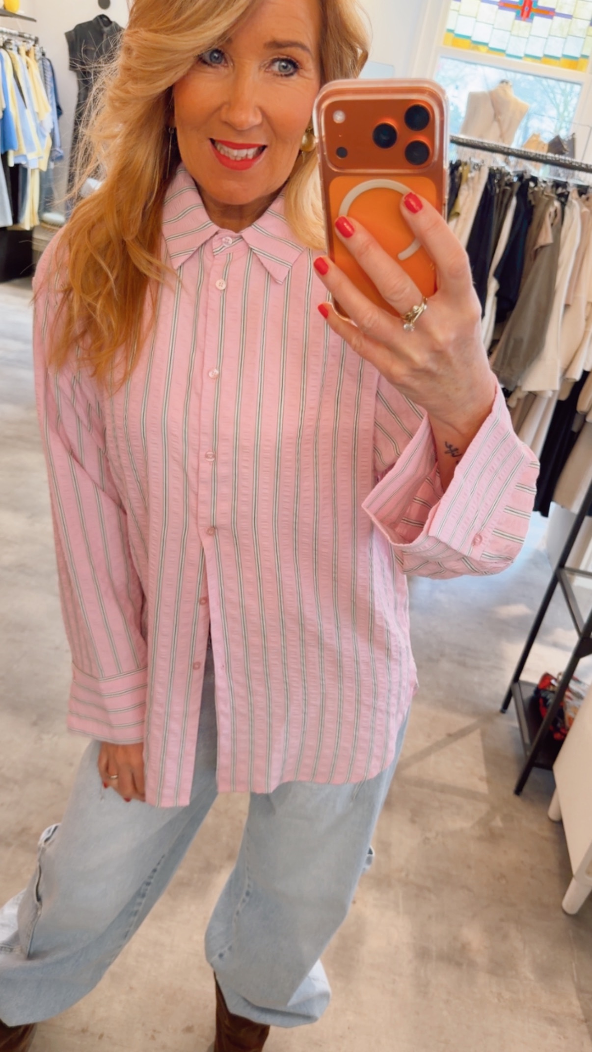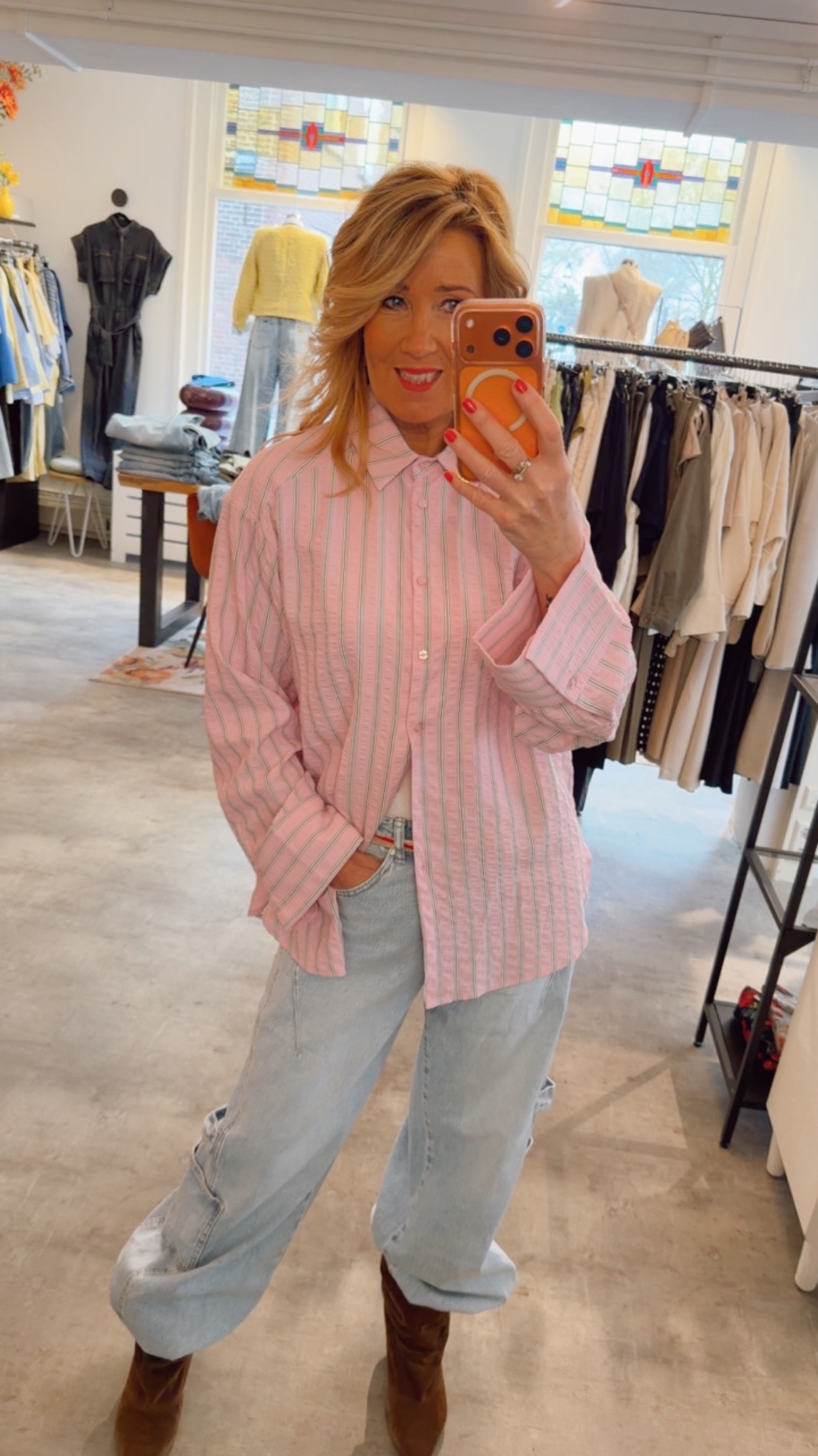 roze blouse met groen streepje en grote losvallende manchetten.
