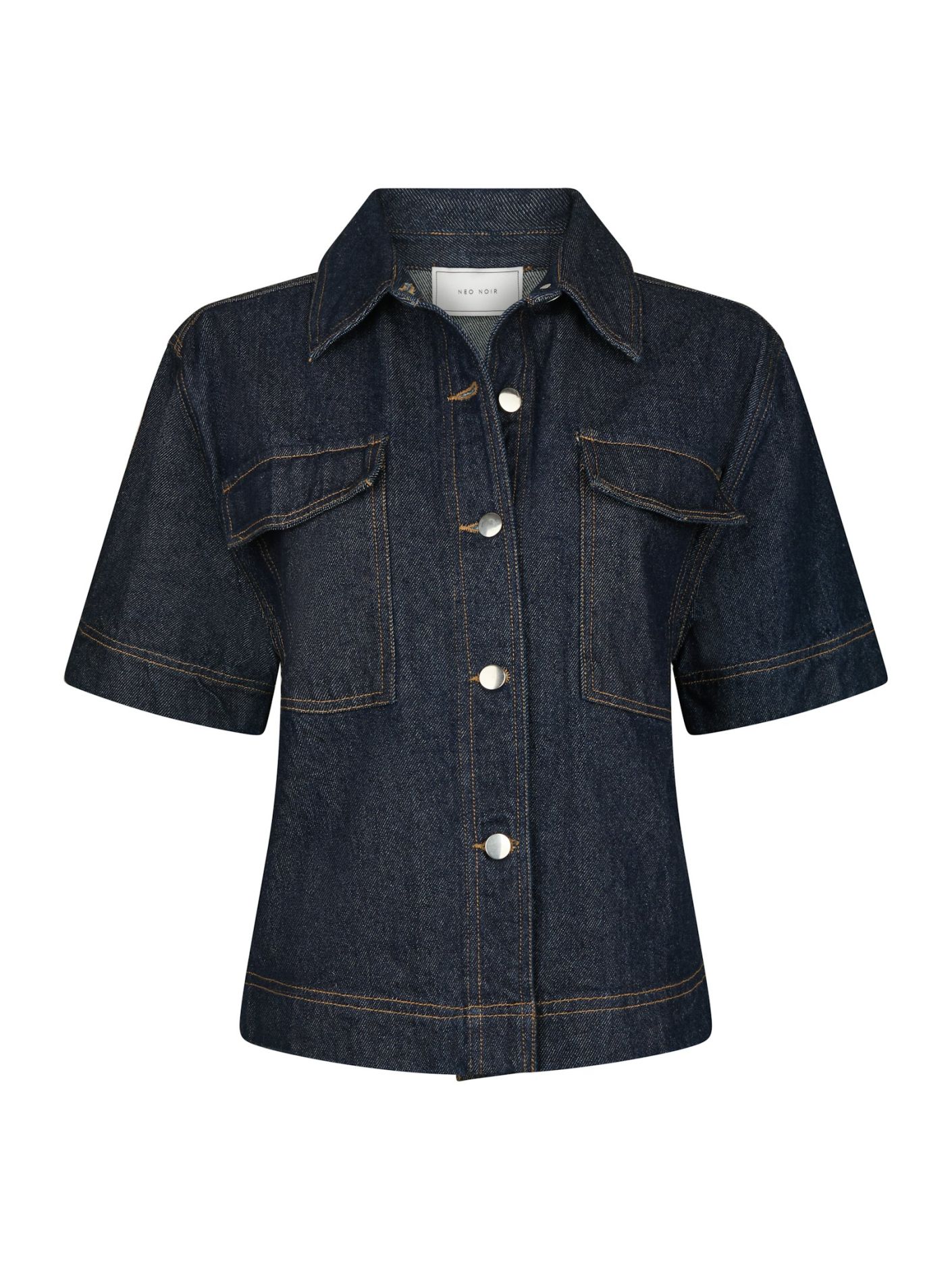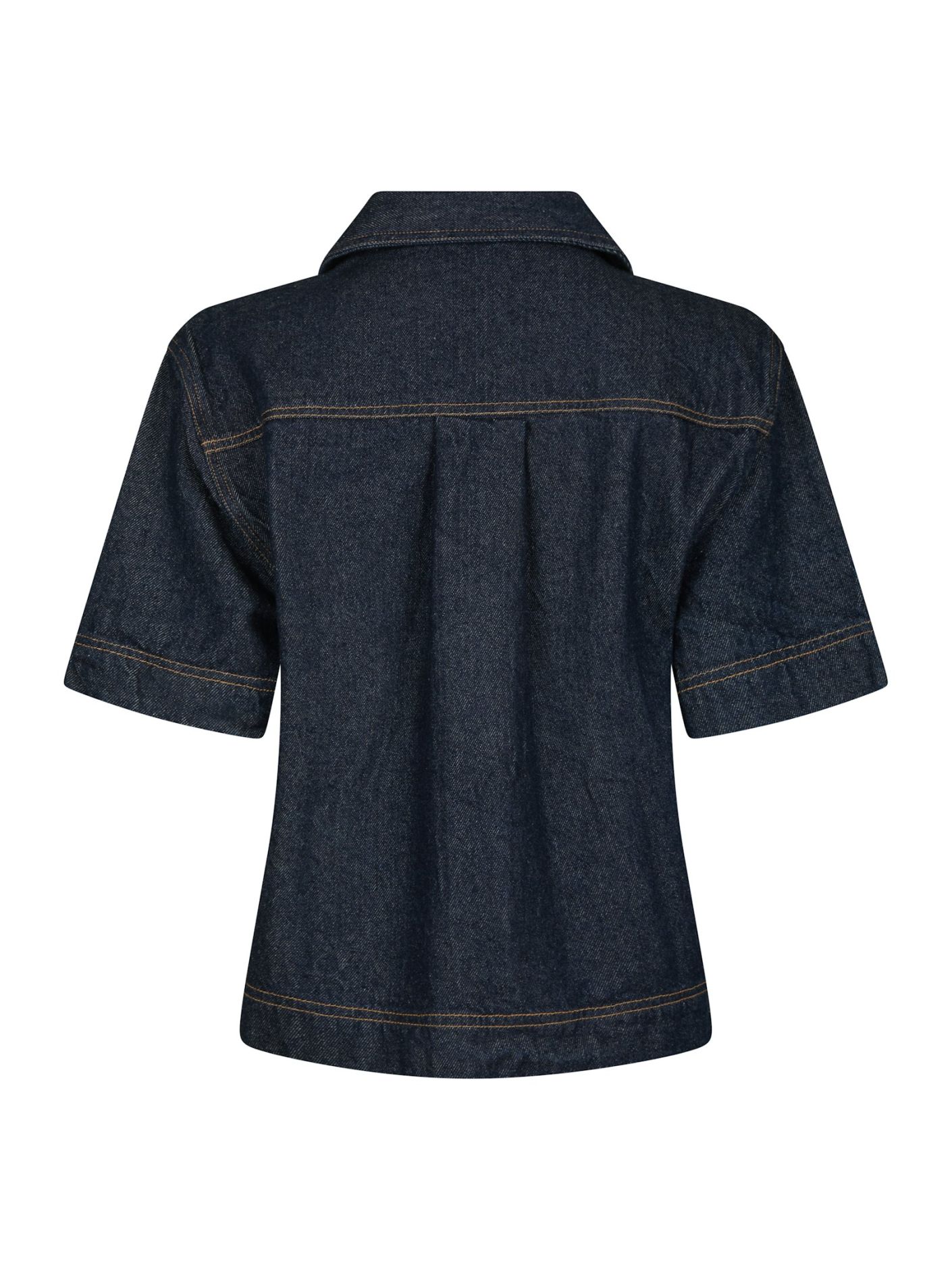 Donker blauw denim shirt met korte mouw en zilverkleurige knoopjes.