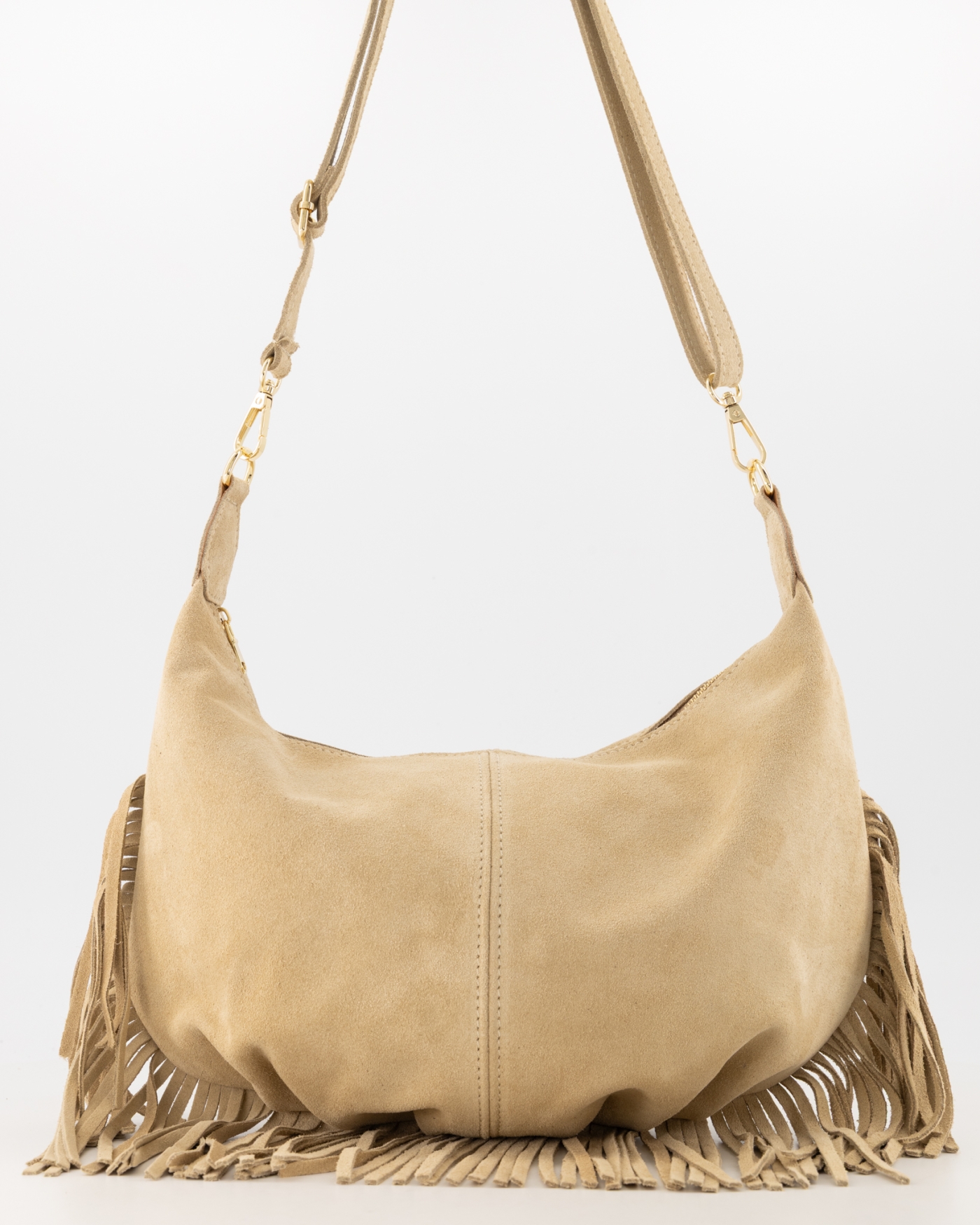 De Vromy suede crossbody tas is vervaardigd van echt leren suede en combineert stijl met functionaliteit. De modieuze franjes geven de tas een trendy uitstraling, terwijl de goudkleurige hardware zorgt voor een luxe afwerking.